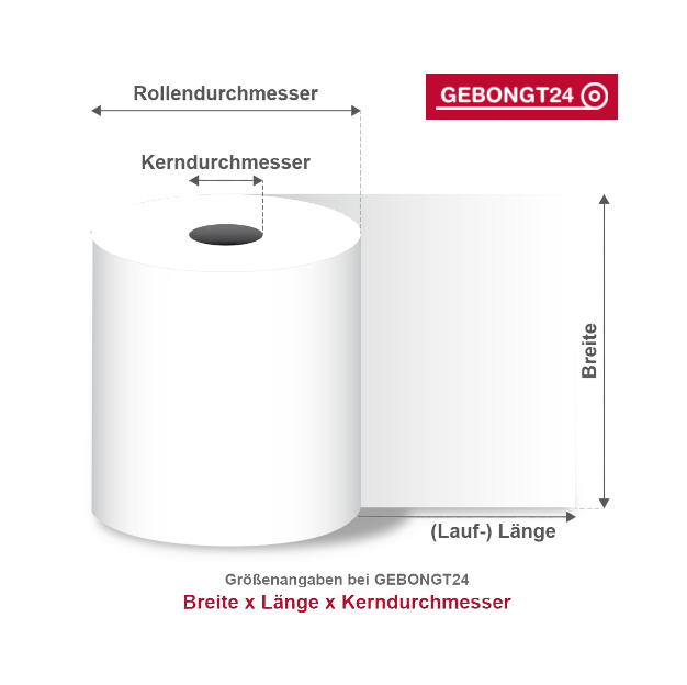Die Maße unserer Kassenrollen geben wir immer wie folgt an: Breite x Länge x Kerndurchmesser